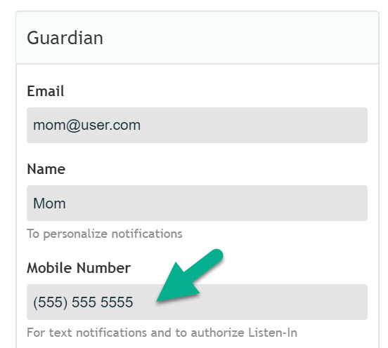 Each Guardian can update their phone numbers after logging in with their personal username and password.